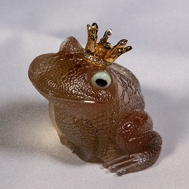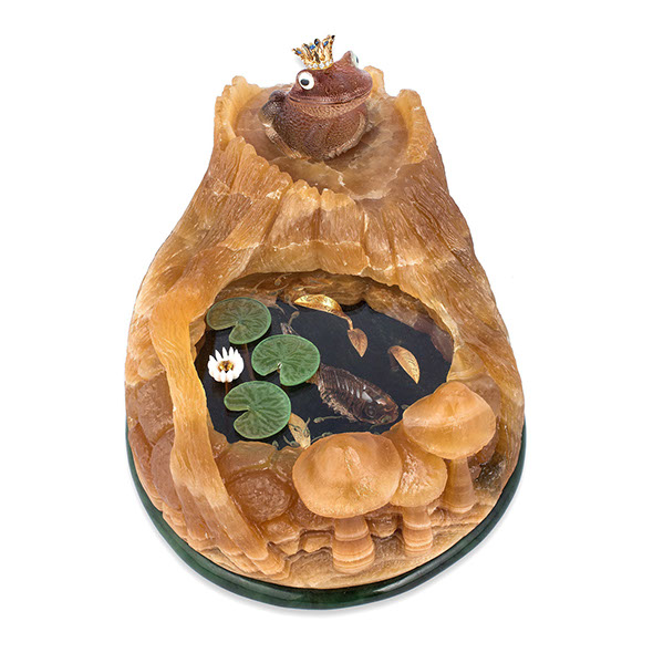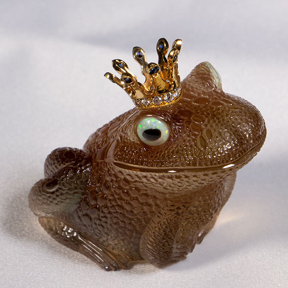 I gave no input, and when he contacted me 6 months later with the final piece, I was completely blown away. To me the fairy tale like scene of 'frog prince' is the the most sophisticated subject matter of all gemstone art with a deep and rich German history. The frog has opal and black jade eyes, with a gold crown set with 13 diamonds and 8 sapphires. The base is made of carved calcite, and the bottom is carved from jade. The lily pads are carved from high quality jade, and the lily is white chalcedony with a yellow sapphire flower. There is gold plant life, and reverse intaglio carved tadpoles.