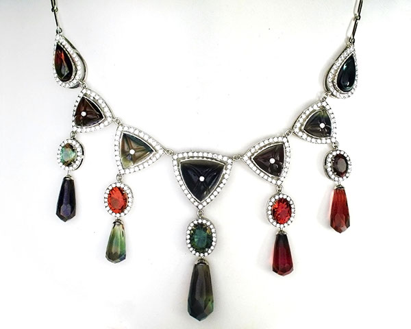 Gold neckless. Design and jewelry work by Dalan Hargrave, Oregon Sunstone by Sunstone Butte. Owned by David Wheatley and Tammy Moreau, Sunstone Butte mine.