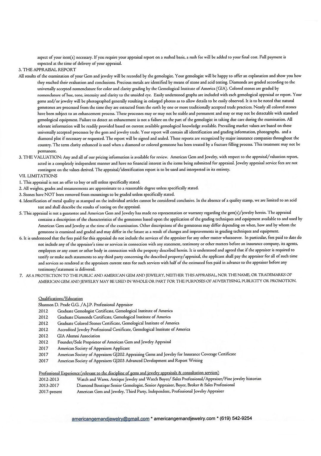 American Gem and Jewelry est un prestataire de services d'expertise et de conseils de bijoux basé en Californie. Shannon Prade est une gemmologue diplômée du GIA à Carlsbad, en Californie et travaille en étroite collaboration avec des clients du monde entier. Elle travaille avec des clients allant du particulier et des collectionneurs aux marchands, aux propriétaires de mines et autres professionnels de la bijouterie. Elle a une passion manifeste pour les pierres de couleur rares et de qualité. Shannon se spécialise dans les gemmes américaines comme la turquoise, la bénitoïte, la bixbite, le bois opalisé du Nevada et la tourmaline californienne. Elle a de l'expérience avec de nombreuses gemmes rares et les minéraux, y compris la Sunstone cuprifère de l’Oregon. La nature investigatrice de Shannon dans ses expertises de gemmes et de bijoux lui a permis de servir de milliers de clients en documents d'expertise avec des détails probants et précis.