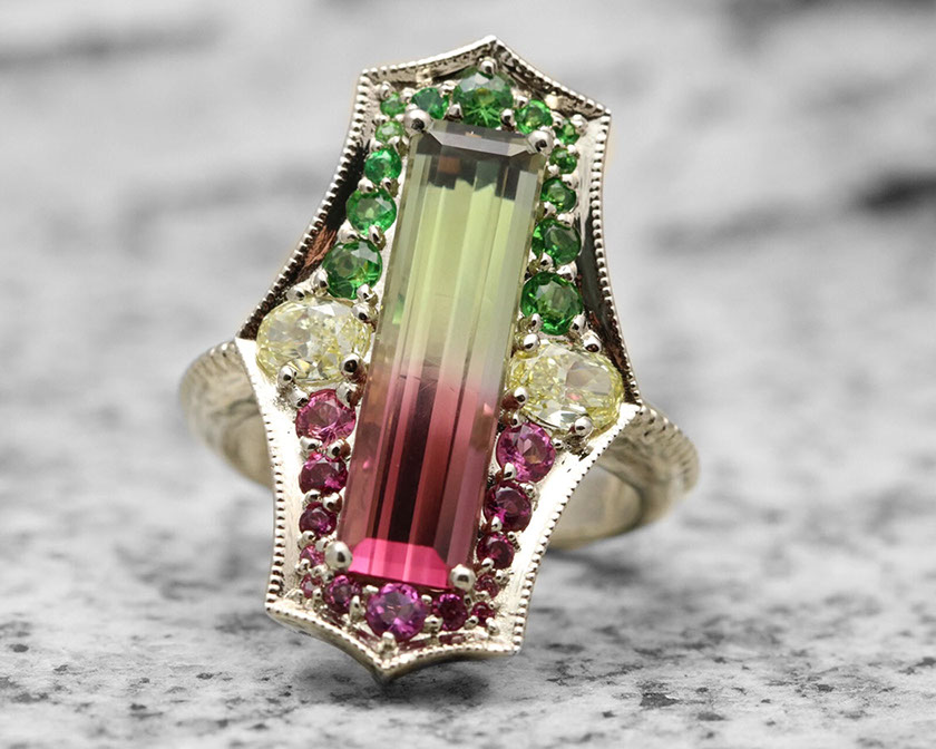 6.06 ct Himalaya mine (California) Tourmaline ring surrounded with tourmaline, tsavorite and yellow diamonds. AGTA Spectrum award 1st place winner 2016 in category Best Use of Color.