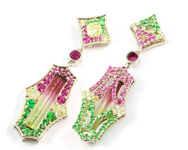 Himalaya mine (California) Tourmaline earrings, 15.51 ct TW with tsavorite, pink tourmaline and fancy yellow diamonds accent stones.