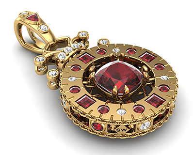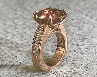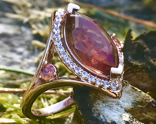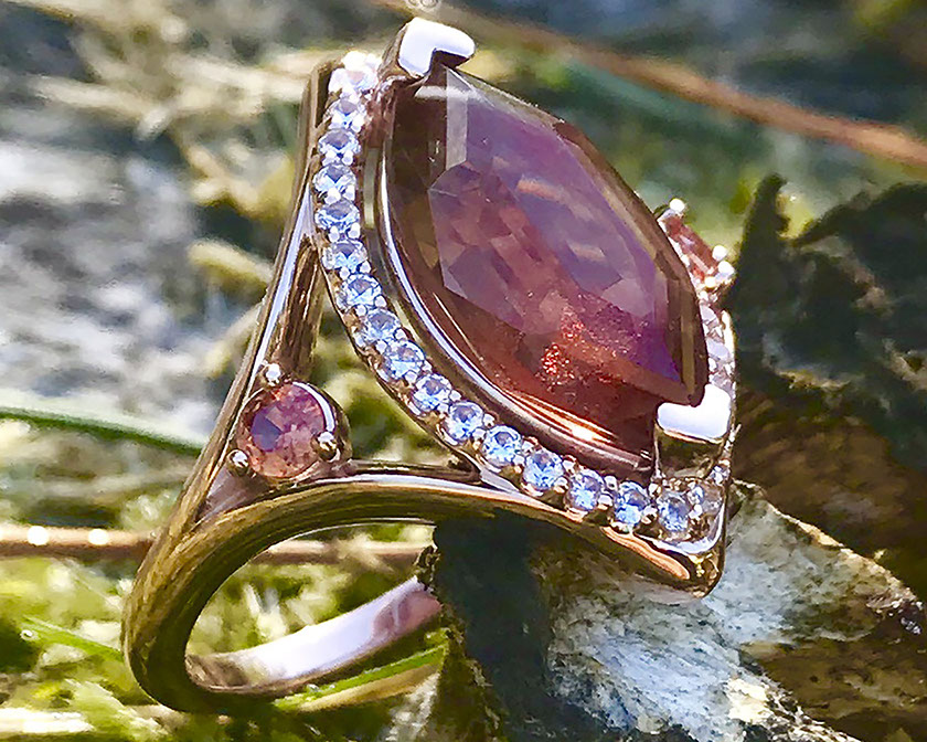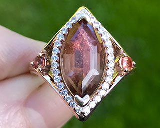 12.00 ct schiller Oregon Sunstone in 14k Rose Gold with white sapphire, rough from Sunstone Butte mine, faceted by Herb Mair (1)