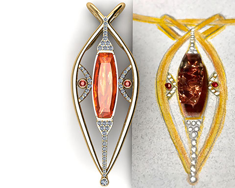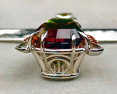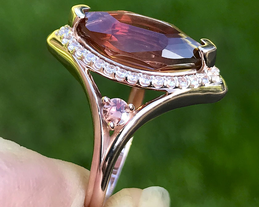 12.00 ct schiller Oregon Sunstone in 14k Rose Gold with white sapphire, rough from Sunstone Butte mine, faceted by Herb Mair (2)