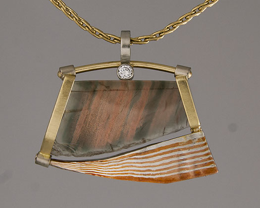 Schiller Oregon Sunstone (Rough from Sunstone Butte) in an 18 karat white and yellow gold mounting with copper/silver mokume-gane and a small diamond.