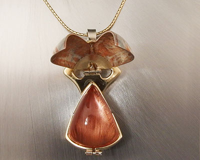 Scarab/Beetle. 14 karat yellow and white gold with copper/silver hinged and flip up mokume-gane wings...