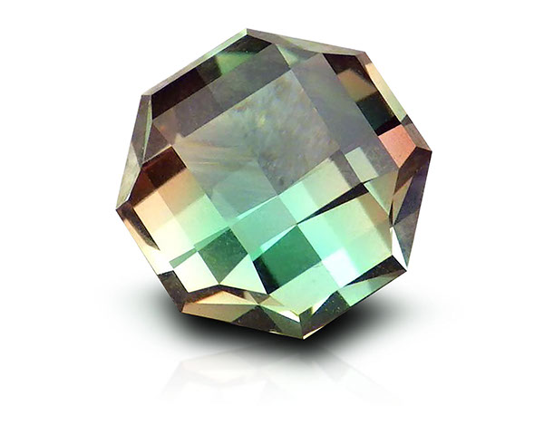 7.93ct cuprian Oregon Sunstone in rare highly valued peacock green-pink-red color blend, rough from PANA Mine, faceted by Ravenstein Gem Co, European Union