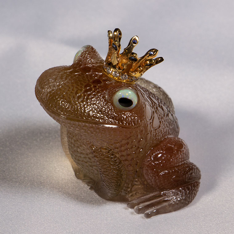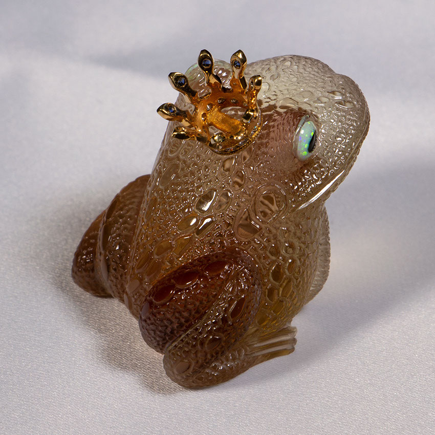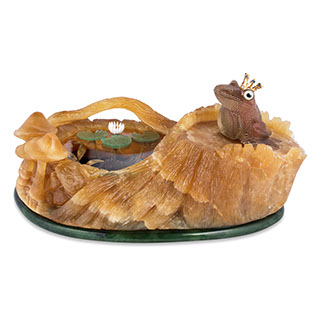 I gave no input, and when he contacted me 6 months later with the final piece, I was completely blown away. To me the fairy tale like scene of 'frog prince' is the the most sophisticated subject matter of all gemstone art with a deep and rich German history. The frog has opal and black jade eyes, with a gold crown set with 13 diamonds and 8 sapphires. The base is made of carved calcite, and the bottom is carved from jade. The lily pads are carved from high quality jade, and the lily is white chalcedony with a yellow sapphire flower. There is gold plant life, and reverse intaglio carved tadpoles.