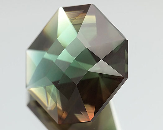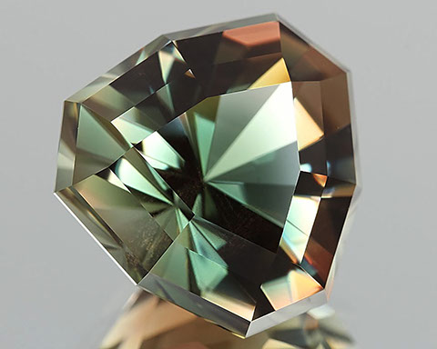 4.72 ct Chrome Green, Red/Raspberry Multicolor Dichroic Oregon Sunstone, with Very Light Schiller, Eye Clean with Perfect Cut and Polish, Shield Cut, 11.1 x 11.1 x 7.8 mm, rough from PANA Mine. (3/3)