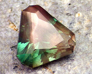 2.94 ct Green Red Dichroic Oregon Sunstone in Arya Akhavan PANA MINE-GEOMETRIC EXPLETIVE cut, rough from PANA Mine, 2018 (2)