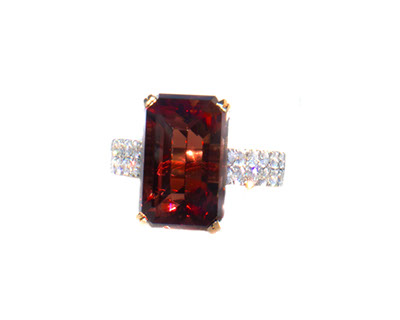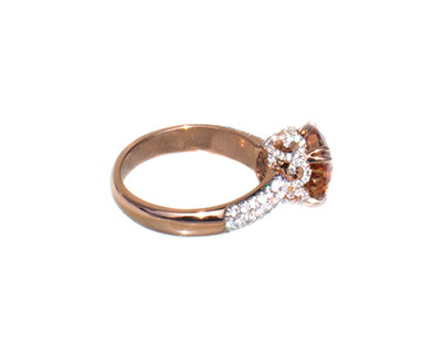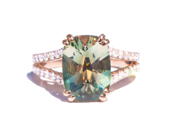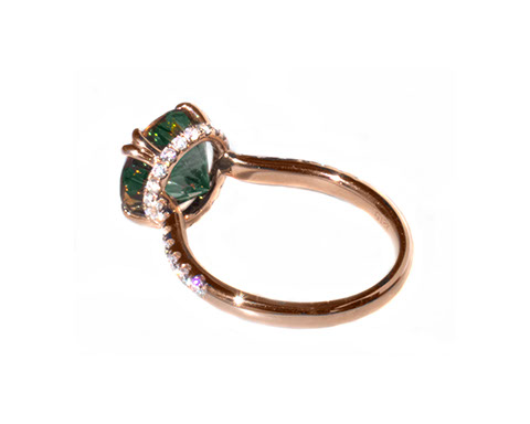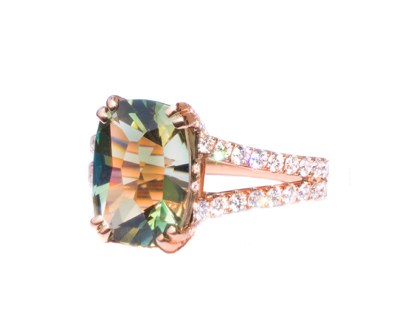 14 Kt rose gold luxury ring with 3.28 ct green dichroic Oregon Sunstone and 0.50 ct accent diamonds. Rough from Spectrum mine (1)