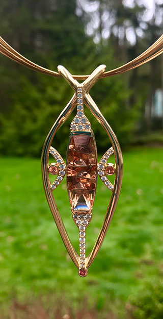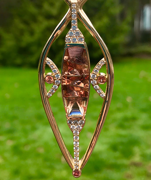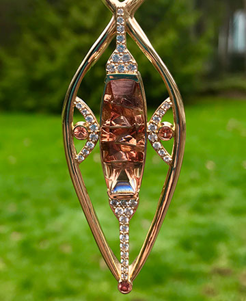 Этот замечательный 62,5 каратный камень был отправлен одному из моих любимых мастеров-художников, который рекомендовал поработать с мастером по огранке – Аэроном Сангенитто. Мы отправили ему разработанный нами дизайн и форму подвески. Мне понравилась предложенная им концепция резки камня, и я спросила, сможет ли он сделать подобную огранку. Результат превзошел мои ожидания.
