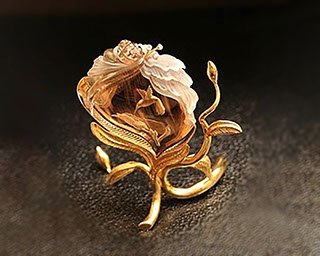 Gold neckless. Design and jewelry work by Dalan Hargrave, Oregon Sunstone by Sunstone Butte. Owned by David Wheatley and Tammy Moreau, Sunstone Butte mine.