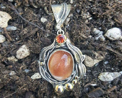 This sterling silver and 14 KT gold pendant features an amazing sunstone with a schiller as the main stone. The accents stone is a beautiful red 4mm sunstone. The sterling silver and gold used in this piece was completely crafted from scratch.
