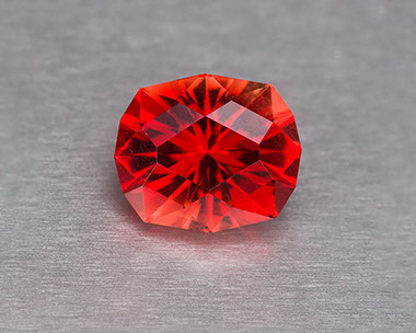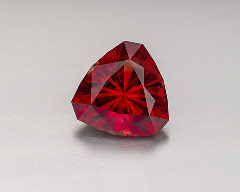 Flawless 22.98 ct neon red cuprian Oregon Sunstone, Pana Mine 2018, faceted by Jeff Hapeman in his own “Triptych” design (studio image 1)