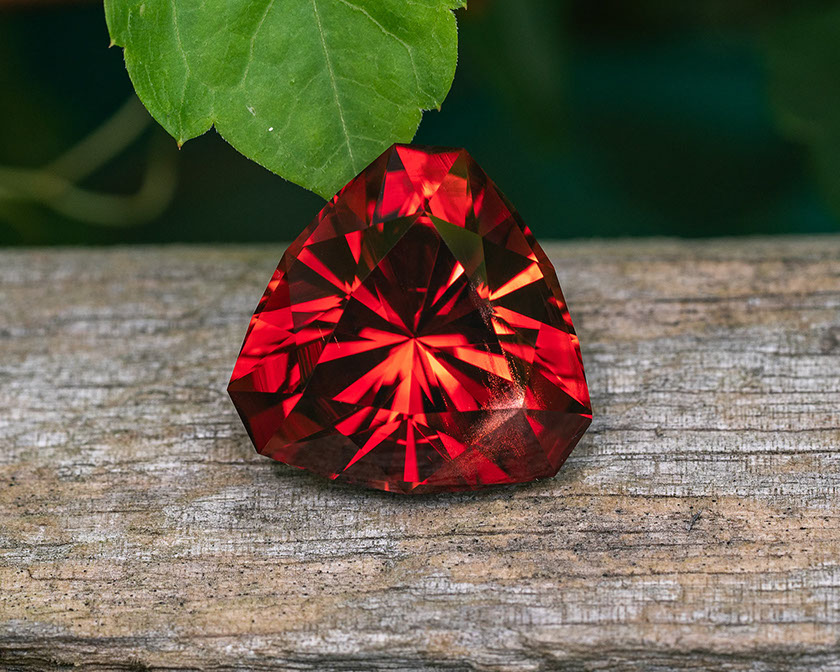Flawless 22.98 ct neon red cuprian Oregon Sunstone, Pana Mine 2018, faceted by Jeff Hapeman in his own “Triptych” design (outdoor image 1)