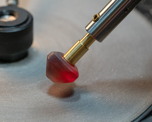 Faceting process of 22.98 ct neon red cuprian Oregon Sunstone, Pana Mine 2018 (image 2)