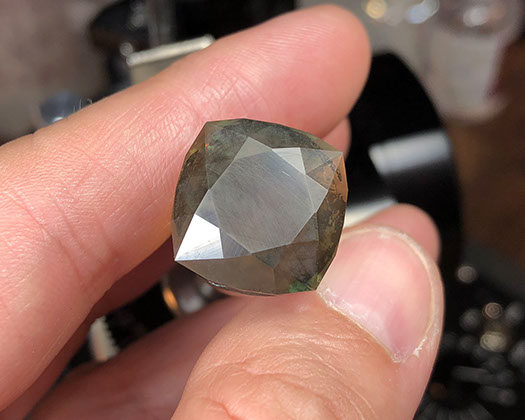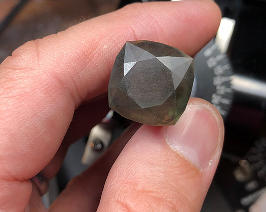 Faceting process of 23.79 ct green dichroic schiller copper-bearing Oregon Sunstone, Pana Mine 2018 (image 2)