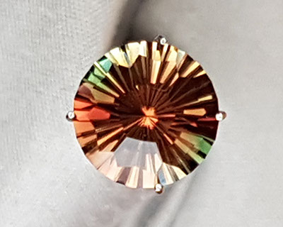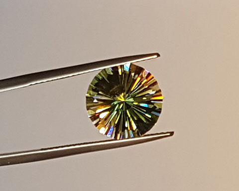 3.65 ct Oregon Sunstone in Fireworks cut, 10.8 mm diameter, rough from PANA Mine