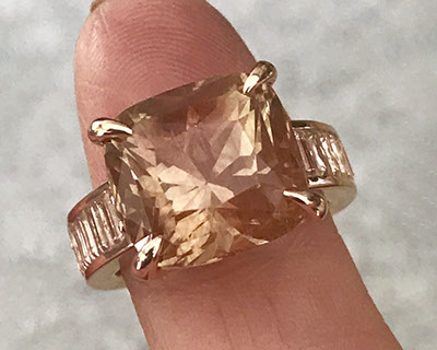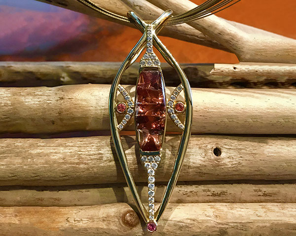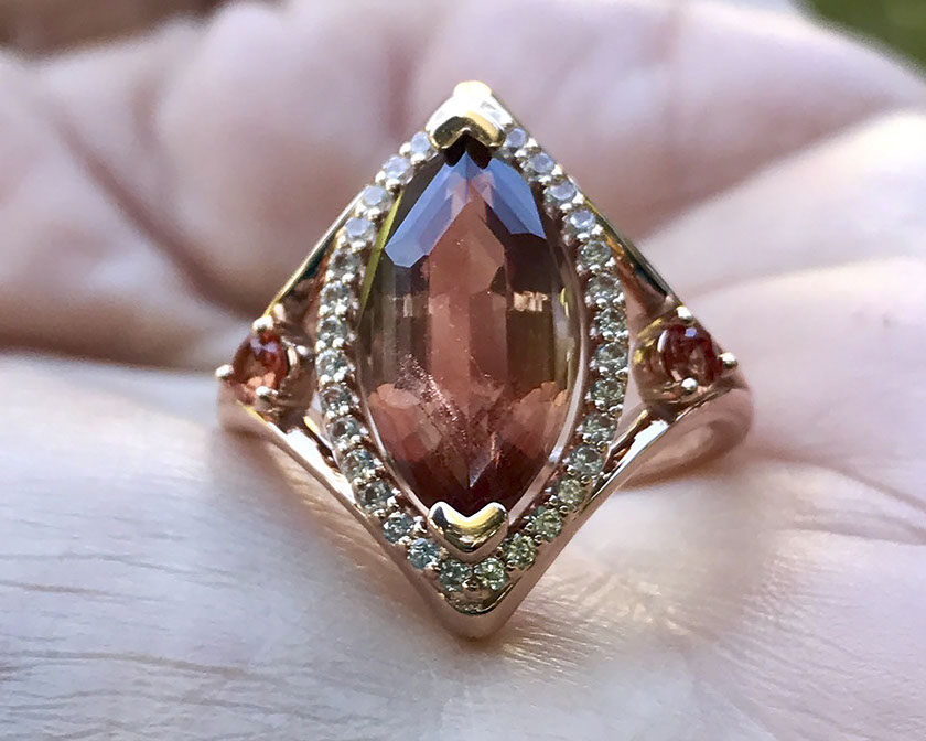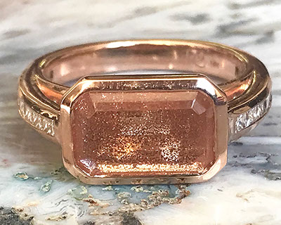 12.00 ct schiller Oregon Sunstone in 14k Rose Gold with white sapphire, rough from Sunstone Butte mine, faceted by Herb Mair (1)