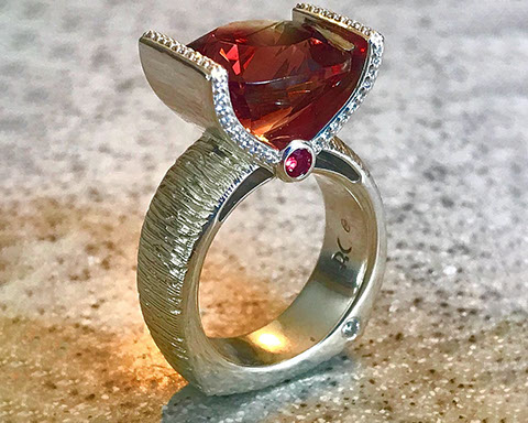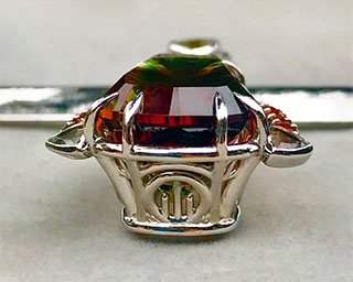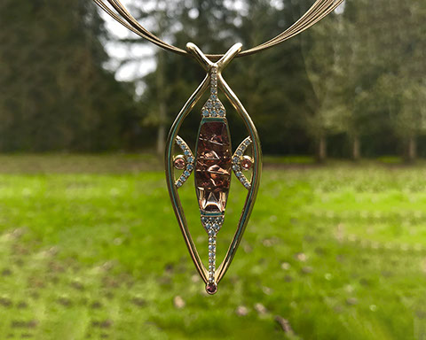 12.00 ct schiller Oregon Sunstone in 14k Rose Gold with white sapphire, rough from Sunstone Butte mine, faceted by Herb Mair (2)