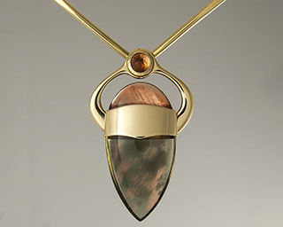 Schiller Oregon Sunstone (Rough from Sunstone Butte) in an 18 karat white and yellow gold mounting with copper/silver mokume-gane and a small diamond.