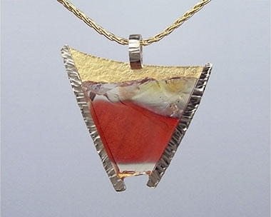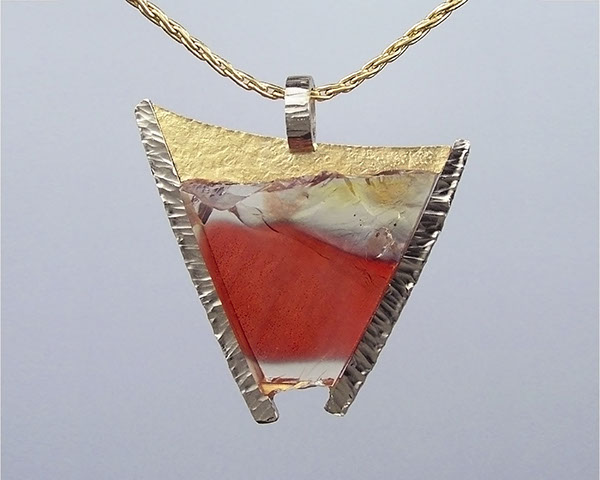 Minimal Intervention Gem Art. 24 ct Orange/Red Schiller Oregon Sunstone (rough from Dust Devil mine) mounted in 14 karat white and yellow gold.